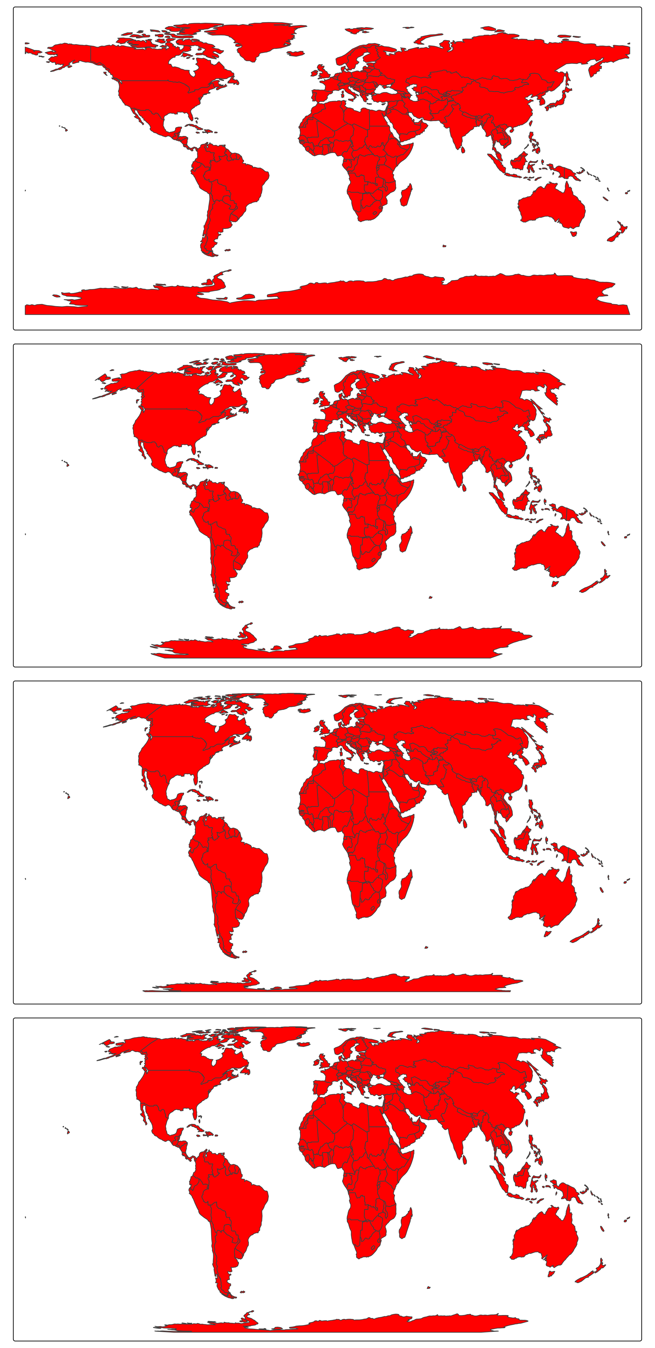 tm_shape(World, crs = "+proj=eqearth") + tm_polygons("red"),