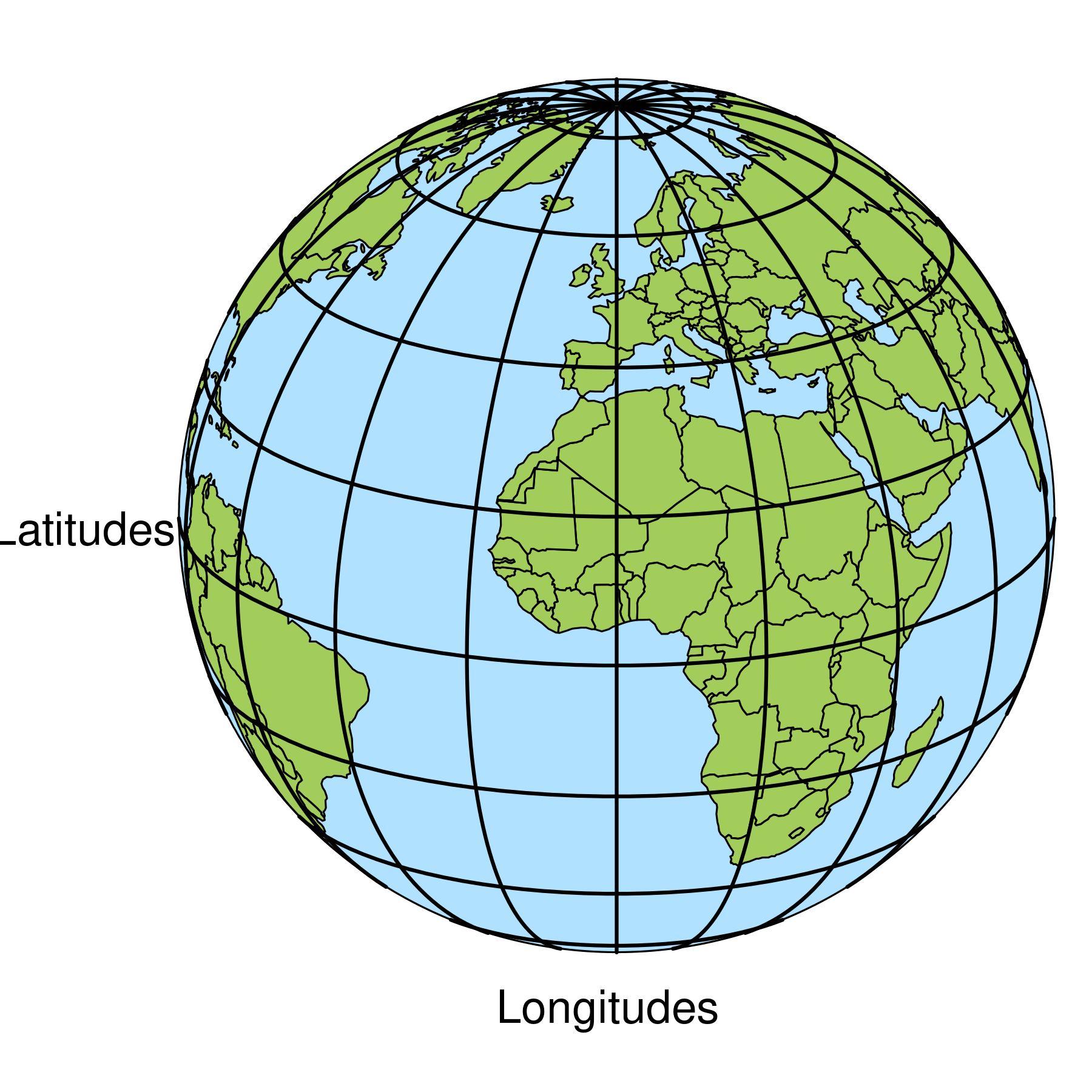 These latitude/longitude coordinates can be accessed via the EPSG number (which is an identifier for a standard CRS) 4326. The formal definition of this CRS can be obtained via sf::st_crs(4326).